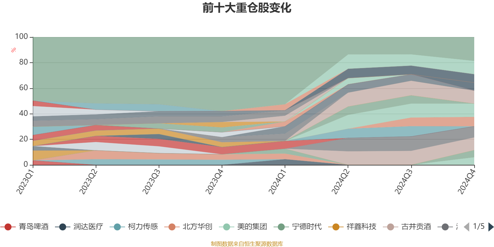 截至2024年四季度末,基金十大重仓股分别是贵州茅台、今世缘、山西汾酒、古井贡酒、泸州老窖、五粮液、迈瑞医疗、海大集团、美的集团、宁德时代。